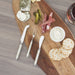 The handles of this stunning cheese knife, spreader, and fork feature sophisticated and elevated neutrals in shades of creamy ivory, crisp white, and elegant taupe. Ideal for entertaining, putting together a delicious cheese board, and gift giving.
