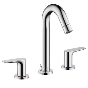 The Logis 150 widespread bathroom faucet uses EcoRight technology with a sophisticated flow limited, special jets, and an infusion of air into the water to create a fuller flow using 60% less water than standard fixtures. Features a high-arc spout and two lever handles with red and blue temperature indicators. The faucet measures 8-7/8" high with a 4-1/4" spout reach. Mounts in three-hole applications with 8" centers in decks up to 1-3/8" thick. Includes a pop-up drain assembly.