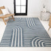 The geometric pattern of this modern rug is inspired by minimalist Scandinavian designs. Soft polypropylene fibers are woven into stripes with abstract arch accents, in a high-low pile that accentuates the pattern. Use this easy-care, family-friendly rug on the porch or deck, or in high traffic spaces like a living room, dining room, or entry.