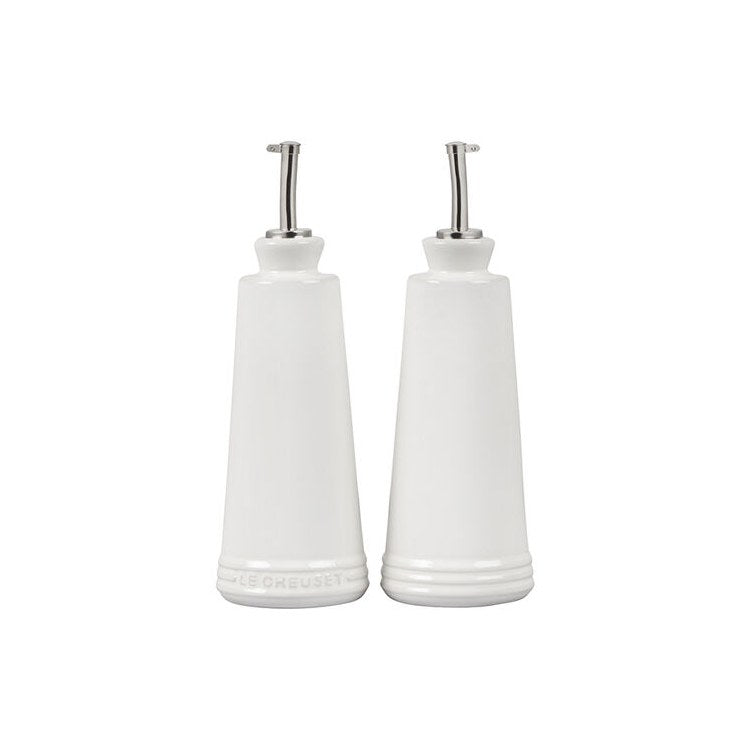 Whether prepping in the kitchen or serving at the table, the Oil and Vinegar cruets are designed to hold and serve all varieties of oils, vinegars and other liquids. Crafted from Le Creuset's finest quality stoneware to protect oils from the damaging effects of light and heat, the contemporary design features a stainless steel nozzle for precise control when pouring. They're finished with an impermeable glaze inside and out that is easy to clean and dishwasher safe, while the addition of the Le Creuset name on one of the bottles makes it easy to distinguish between the set of two.