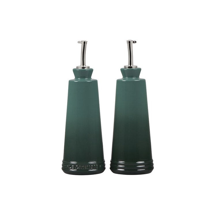 Whether prepping in the kitchen or serving at the table, the Oil and Vinegar cruets are designed to hold and serve all varieties of oils, vinegars and other liquids. Crafted from Le Creuset's finest quality stoneware to protect oils from the damaging effects of light and heat, the contemporary design features a stainless steel nozzle for precise control when pouring. They're finished with an impermeable glaze inside and out that is easy to clean and dishwasher safe, while the addition of the Le Creuset name on one of the bottles makes it easy to distinguish between the set of two.