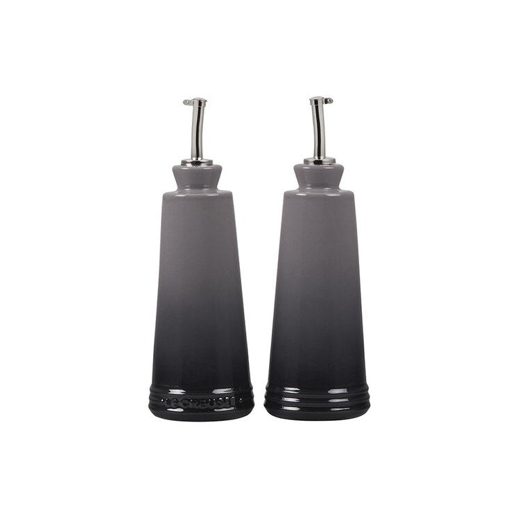 Whether prepping in the kitchen or serving at the table, the Oil and Vinegar cruets are designed to hold and serve all varieties of oils, vinegars and other liquids. Crafted from Le Creuset's finest quality stoneware to protect oils from the damaging effects of light and heat, the contemporary design features a stainless steel nozzle for precise control when pouring. They're finished with an impermeable glaze inside and out that is easy to clean and dishwasher safe, while the addition of the Le Creuset name on one of the bottles makes it easy to distinguish between the set of two.