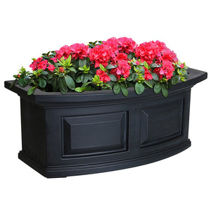 Give your home a classic look with these Nantucket Window Boxes. This 24" decorative planter features a bowed front, raised panel design, pronounced crown molding detail, built-in overflow drains, and a sub-irrigation water system that keeps the soil moist to encourage root growth. Made of durable, high-grade polyethylene with a double-wall design, the planters are weather resistant and low maintenance for long-lasting beauty. Includes two steel wall-mount brackets with a black powder-coated finish. Made in the USA. Mayne products are backed by a 15-year manufacturer's warranty against fading, bulging, and cracking.
