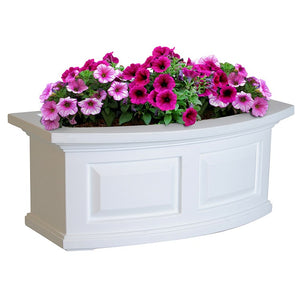 Give your home a classic look with these Nantucket Window Boxes. This 24" decorative planter features a bowed front, raised panel design, pronounced crown molding detail, built-in overflow drains, and a sub-irrigation water system that keeps the soil moist to encourage root growth. Made of durable, high-grade polyethylene with a double-wall design, the planters are weather resistant and low maintenance for long-lasting beauty. Includes two steel wall-mount brackets with a black powder-coated finish. Made in the USA. Mayne products are backed by a 15-year manufacturer's warranty against fading, bulging, and cracking.