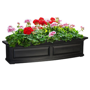 Give your home a classic look with these Nantucket Window Boxes. This 48" decorative planter features a bowed front, raised panel design, pronounced crown molding detail, built-in overflow drains, and a sub-irrigation water system that keeps the soil moist to encourage root growth. Made of durable, high-grade polyethylene with a double-wall design, the planters are weather resistant and low maintenance for long-lasting beauty. Includes two steel wall-mount brackets with a black powder-coated finish. Made in the USA. Mayne products are backed by a 15-year manufacturer's warranty against fading, bulging, and cracking.