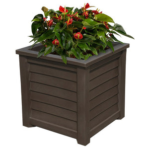 The Lakeland Patio Planter has the look of wood without the upkeep. Molded from high-grade polyethylene with UV inhibitors for lasting beauty and durability, this 20" planter offers a classy choice for your outdoor decor needs. Create a coastal appeal with the white finish or choose from black or espresso for more contemporary look. The double-walled planter has a built-in water reservoir to encourage healthy plant growth by allowing plants to practically water themselves. Made in the USA. Mayne products are backed by a 15-year manufacturer's warranty against fading, bulging, and cracking.