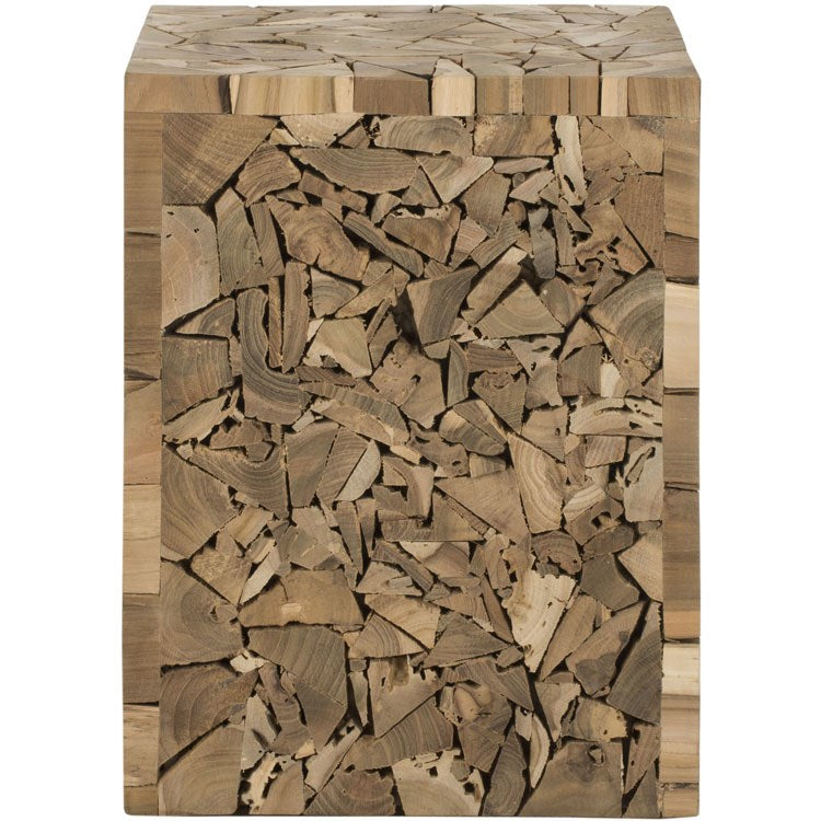 Add warmth and texture to sleek contemporary rooms with Forbes, an innovative piece that can be used as a stool or side table. Crafted from reclaimed teak, the surface is actually a mosaic of teak root chips in medium oak finish. No assembly required.