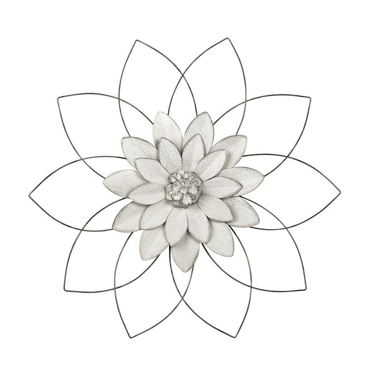 This eye-catching 20" metal flower wall decor that will beautify any open wall space in the rooms of your home. The bold and prominent piece features white center petals framed by open wire outer petals. Hang it anywhere you need an eye-catching focal accent.