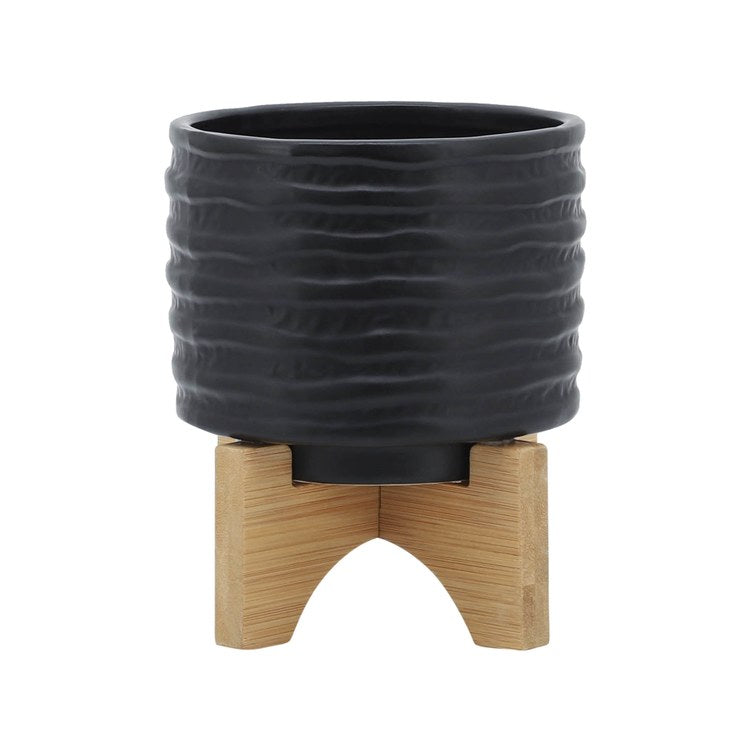 Create a beautiful plant display with this 5" high textured ceramic planter pot. Made of ceramic and finished in black, it features an embossed wavy stripe design to give it texture and visual interest. A solid wood stand keeps the container elevated, and the planter's design perfectly complements any existing interior design style.
