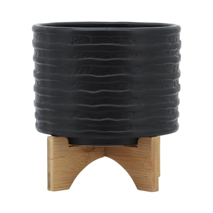 Create a beautiful plant display with this 7" high textured ceramic planter pot. Made of ceramic and finished in black, it features an embossed wavy stripe design to give it texture and visual interest. A solid wood stand keeps the container elevated, and the planter's design perfectly complements any existing interior design style.