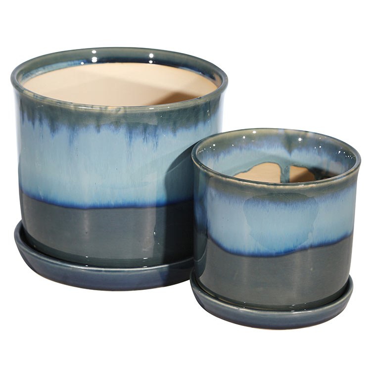 Blue/Gray Ceramic Planters with Saucers Set of 2