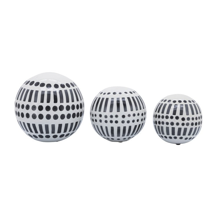 Indulge in artful style with this set of three ceramic orbs in 3", 4", and 5" sizes. Each orb features a unique dot and dashed line pattern in black that will accentuate your living or work space. These orbs will be the ideal item to make your home decor stand out whether you display them alone or use them as filler in a basket, bowl, or tray.