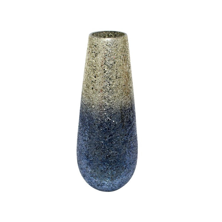 A beautiful way to make a statement with color and design, this 18" high table vase can be the centerpiece to any table, featuring a crackled finish, with a silver blue ombre paint job. Use this crackled glass vase to display a thoughtful bouquet or as a self-standing piece to make a colorful statement.