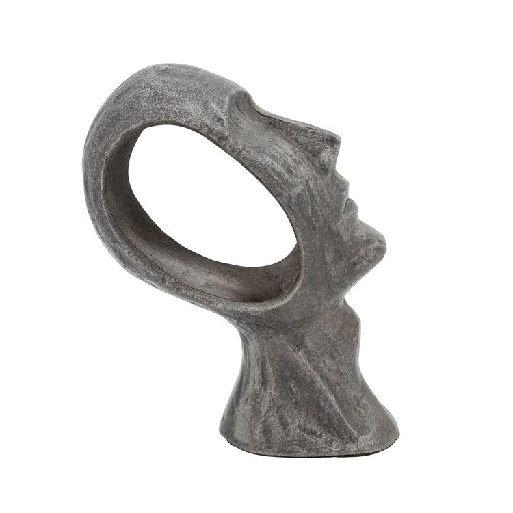 An artistic metal face sculpture will bring a contemporary touch to your home decor. This modern take on the human head is a symbol of the freedom of thought and a reminder to be open-minded in your thinking. Finished in a deep gunmetal, this 11" high aluminum sculpture will add a touch of elegance and style to any home.