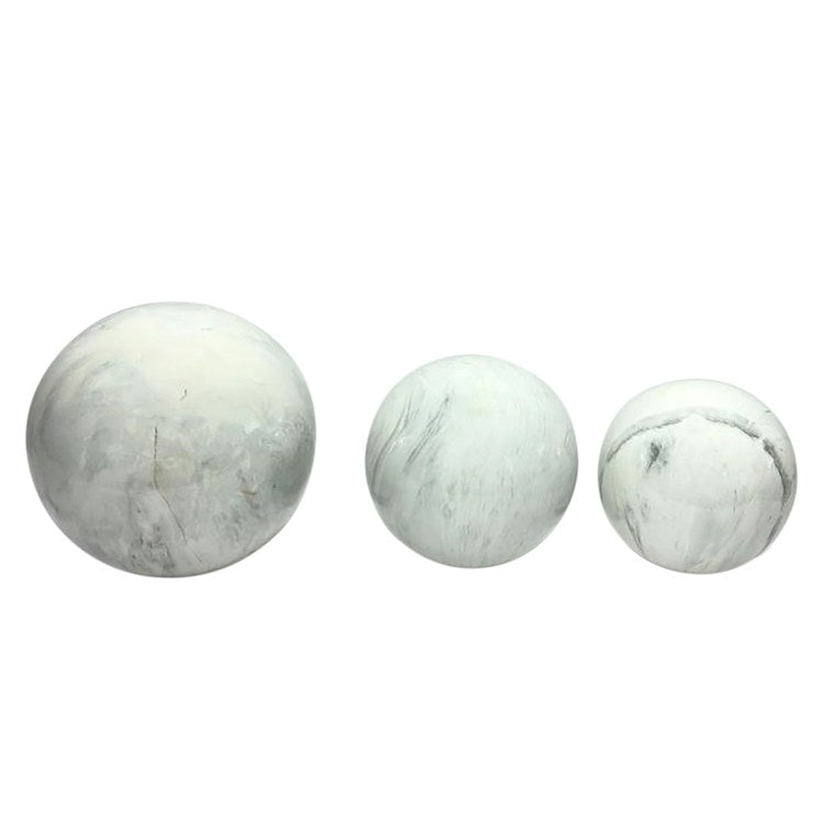 This stunning set of three white marble-finished ceramic orbs are the perfect addition to any table top display. They make great paperweights in your office, filler in a centerpiece bowl on your dining room, or decorative accents gracing a tray on your coffee table or console.