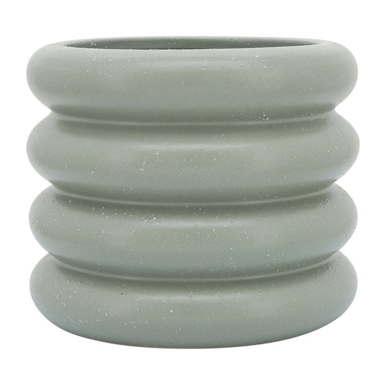 With a profile formed by four rings stacked together, this Bidendum planter has a design that will never be overlooked. Made of ceramic and finished in sage green, the round planter measures 9" wide x 8" high. Filled with your favorite plants, it will create a striking showcase for your botanical displays.
