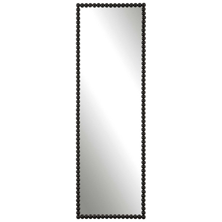 The iron frame of the Serna tall wall mirror features a beaded profile finished in a stylish satin black. May be hung horizontally or vertically.