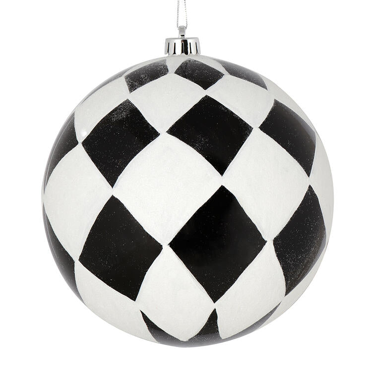 Brighten up your holiday decor with this set of eye-catching Vickerman 4.75" Red Ball with White Diamond Glitter Christmas Ornaments. Each ornament is made of shatterproof plastic, and features a black and white glitter-accented diamond pattern. It is the perfect addition to any holiday decorating project. There are 4 ornaments per pack.